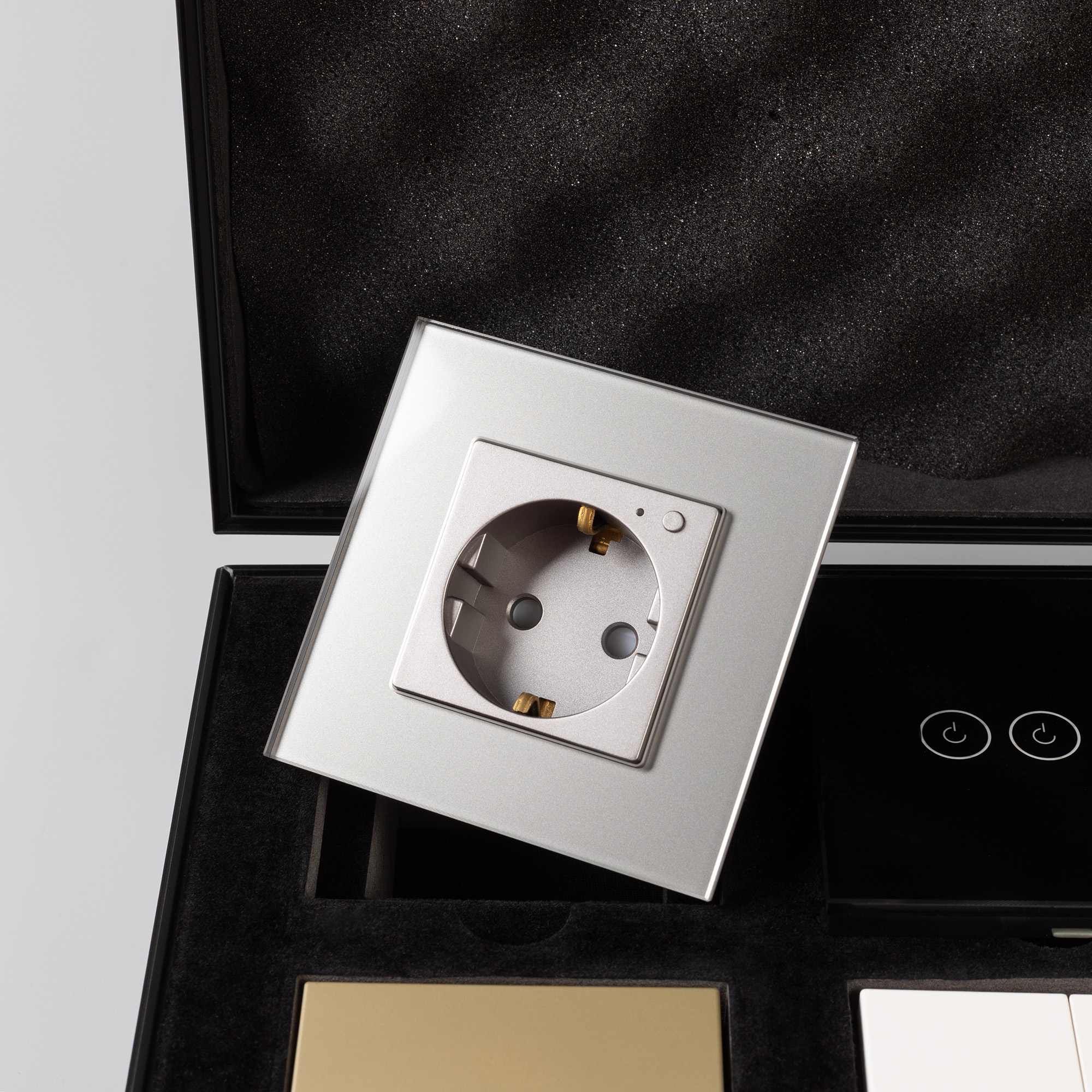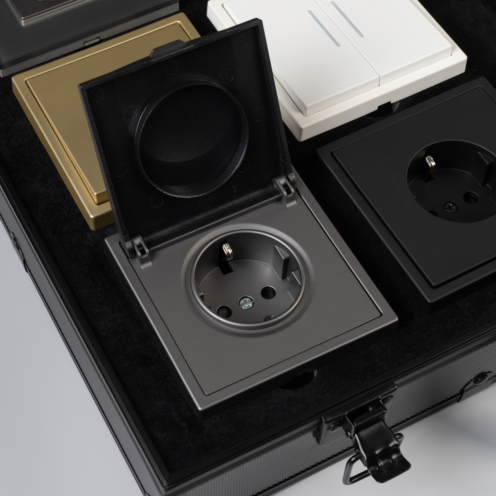 Демо-кейс с наполнением серии NOBE и OMALI. Демо-кейс содержит: Рамки серии NOBE в цветах белый, черный, золотой и серебристый (серый). Поверхность рамок имеет Soft-Touch покрытие: арт.054212 - 2шт арт.054213 - 2шт арт.054214 - 2шт арт.054211 - 2шт Механизм выключателя на одну клавишу (непроходной) в золотом цвете - арт.054253. Механизм выключателя на две клавиши с подсветкой LED (непроходной) в белом цвете - арт.054239. Механизм розетки под евровилку в черном цвете - арт.054277 Механизм розетки влагозащищенный в серебристом(сером) цвете - арт.054283 Выключатель сенсорный на одну клавишу с Zigbee управлением в белом цвете - арт.050035 Выключатель сенсорный на две клавиши с Zigbee управлением в золотом цвете - арт. 050038 Выключатель сенсорный на три клавиши с Zigbee управлением в черном цвете - арт. 050046 Розетка с Zigbee управлением в серебристом(сером) цвете - арт. 050101 Рамки представленной серии накладного типа монтажа - не требуют дополнительного оборудования для установки рамки на механизме.