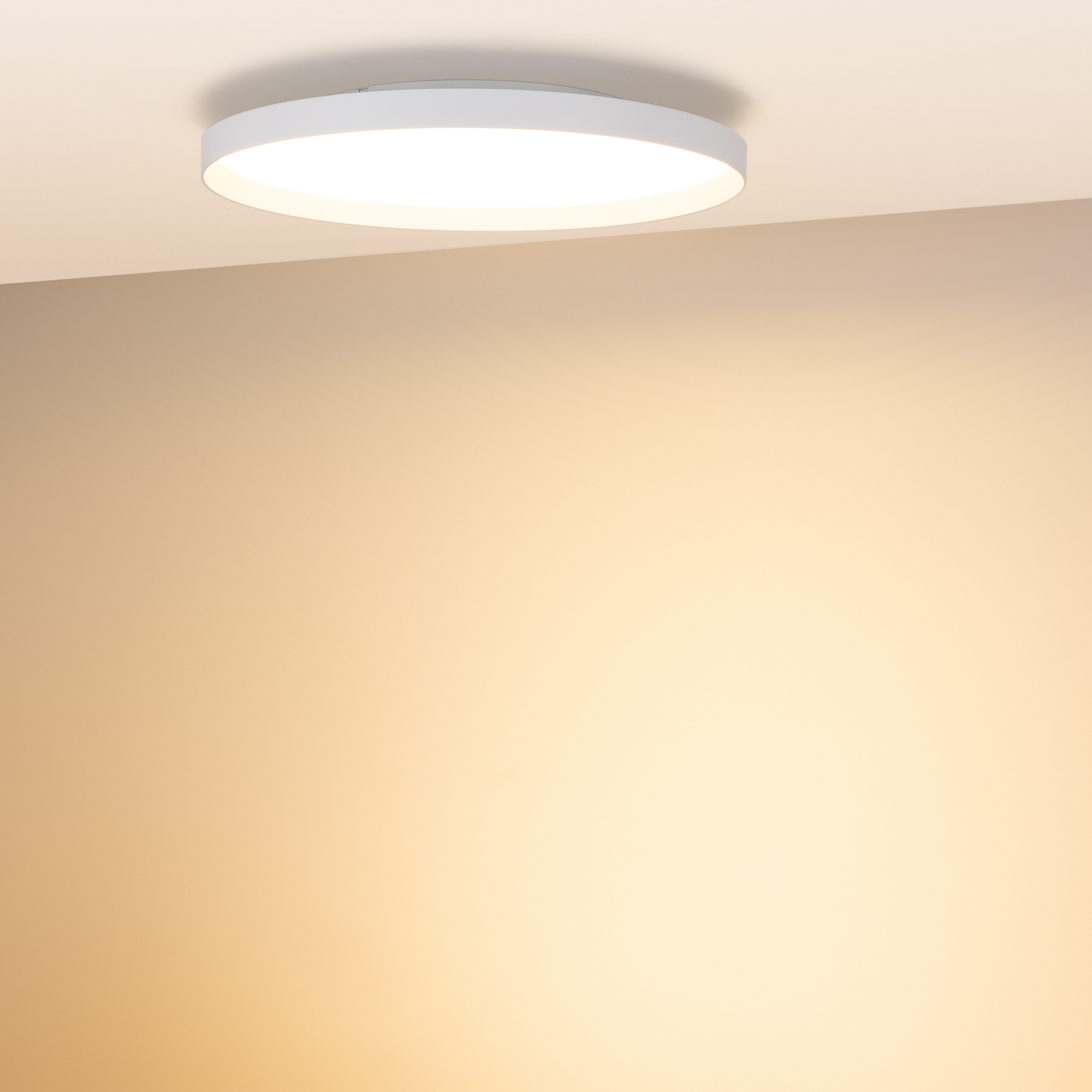 Светодиодный накладной светильник с изменяемой цветовой температурой. Мощность 50 Вт, св. поток 3340-3730 лм, 80-85 лм/Вт, теплый 2700 K, теплый 3300 K, дневной 4000K (переключается), CRI>92, угол 80°, напряжение питания 230 В. Белый круглый корпус из алюминия, матовый призматический экран PC, степень защиты IP20. Размер: Ø 600х70 мм. Размер световой части: Ø 600х39 мм, размер основания: Ø 375х34мм. Монтаж накладной. Драйвер 27-42 В, 1200 мА, пульсация <0,3%. Диммирование TRIAC.